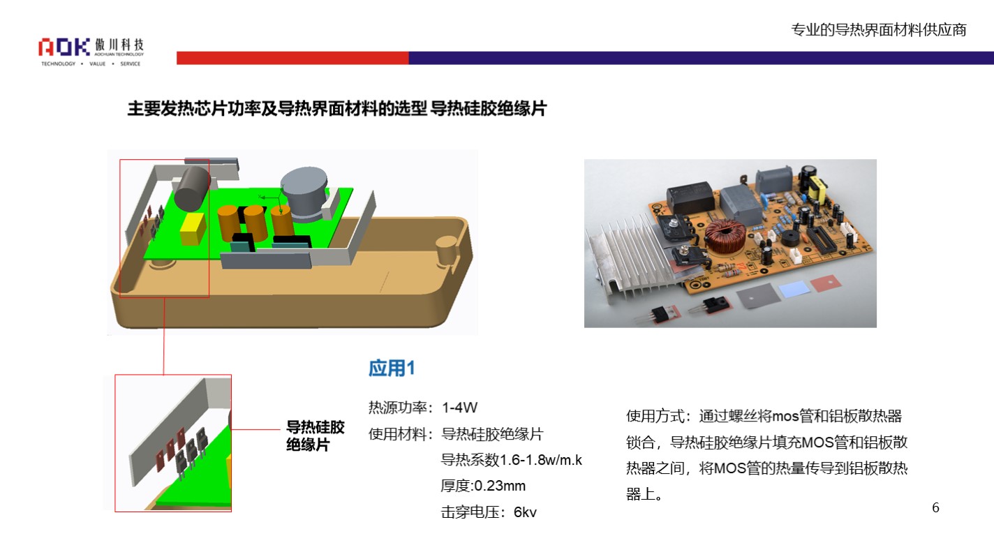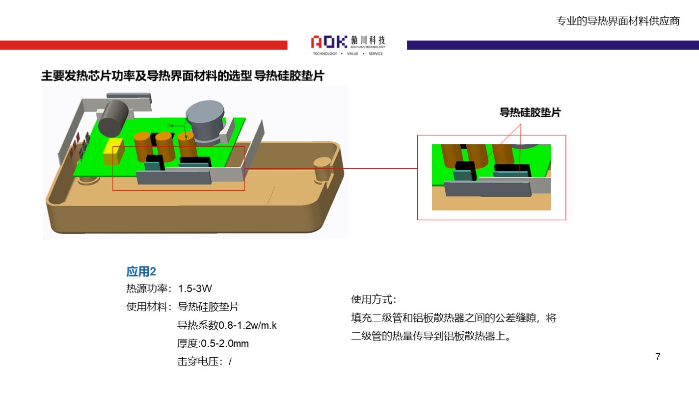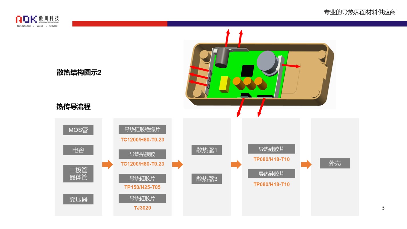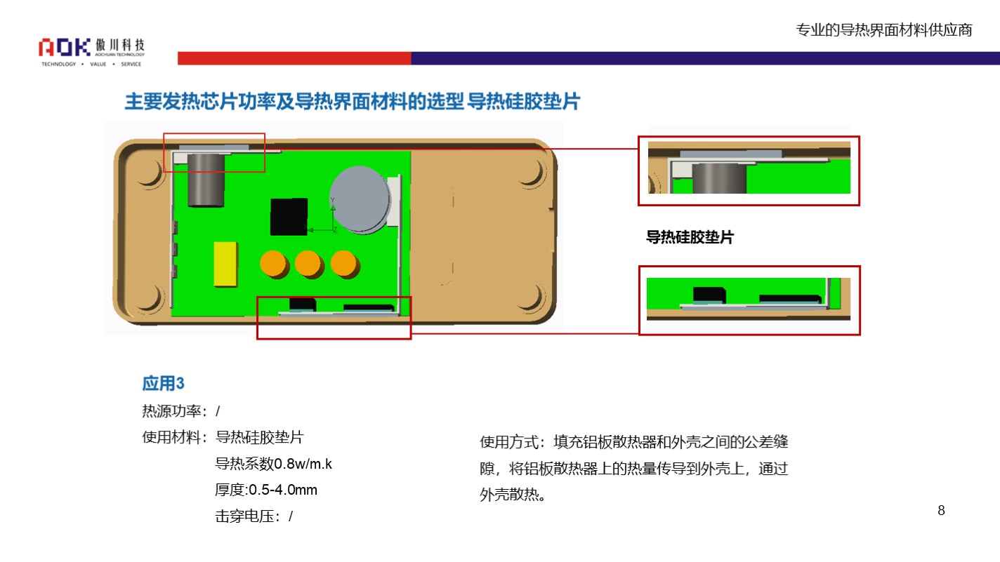 该导热解决方案,可采用傲川TC系列导热硅胶绝缘片,具体应用部位、导热材料选型、使用方式可参考下图: